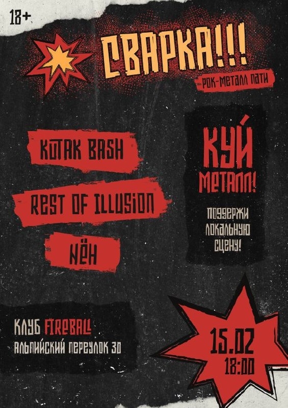 СВАРКА ПАТИ Сварка - это про соединение! Разные стили, люди и сцены сходятся в одной точке и работают как одно целое. Металл, хардкор, электроника. Разный вайб, разная энергия. В этот вечер все работает как один искрящий поток, объединяющий всех в зале На сцене будут играть: KUTAK BASH Rest Of Illusion NЁH В программе: - живая […]